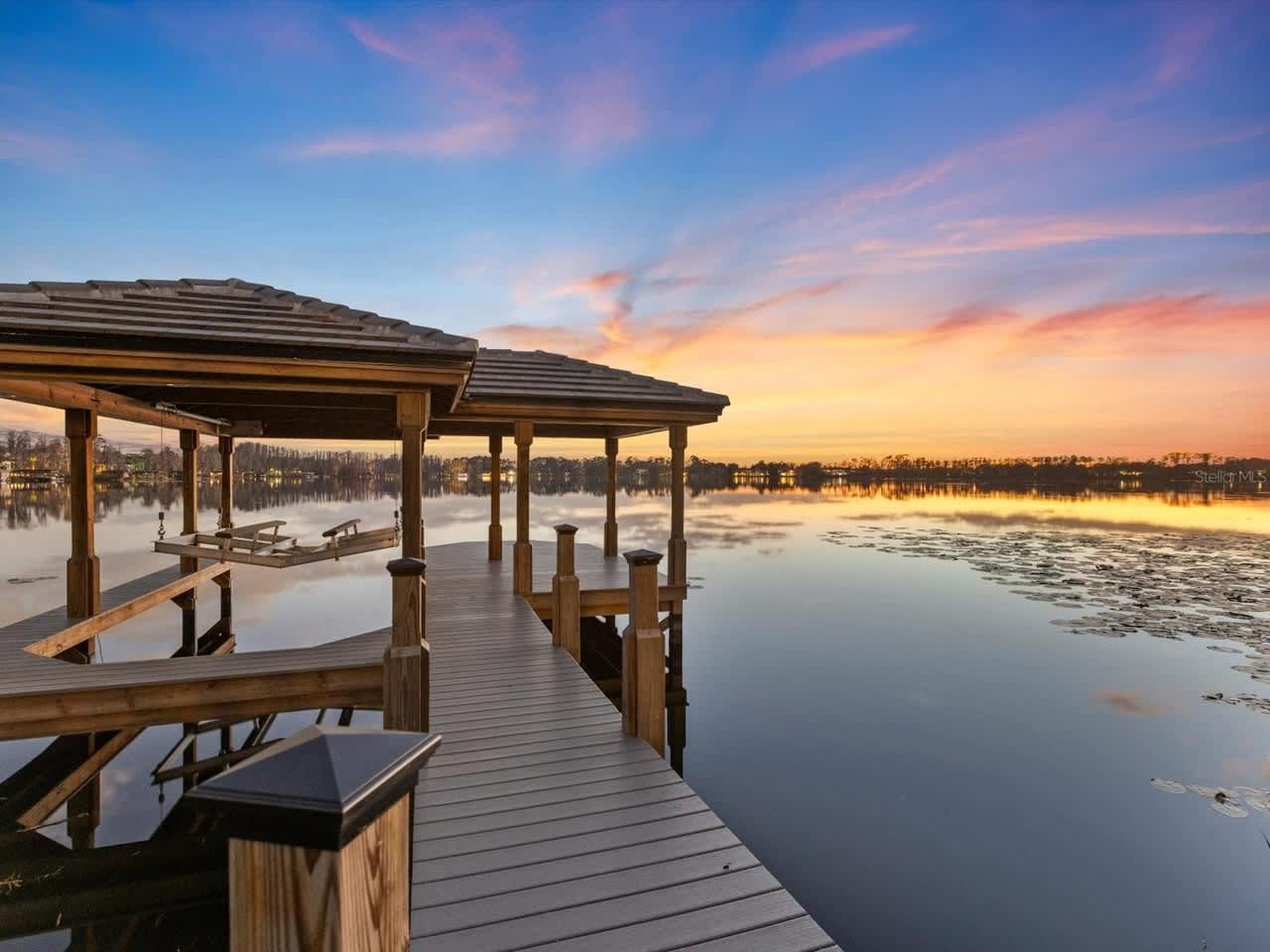 Beyond the interior, the outdoor space rivals any five-star resort. A saltwater pool with a sun shelf, water features, and an infinity ledge overlooks Lake Blanche, with nightly Disney fireworks lighting up the horizon. A private dock provides direct access to the Butler Chain of Lakes, adding an exclusive layer of waterfront living to this already extraordinary property.