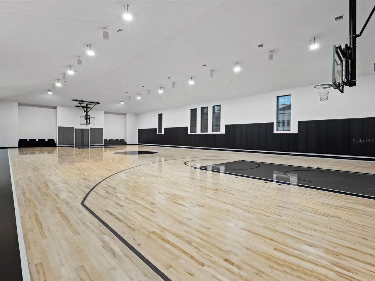 The primary suite delivers the ultimate in luxury living. It boasts a private balcony with invisible electronic screens and a two-story custom closet complete with a hidden shoe room and private laundry. The home offers entertainment spaces unlike any other, including a movie theater with a custom starry night ceiling, and a full-size indoor NBA regulation basketball court, which is fully air-conditioned.